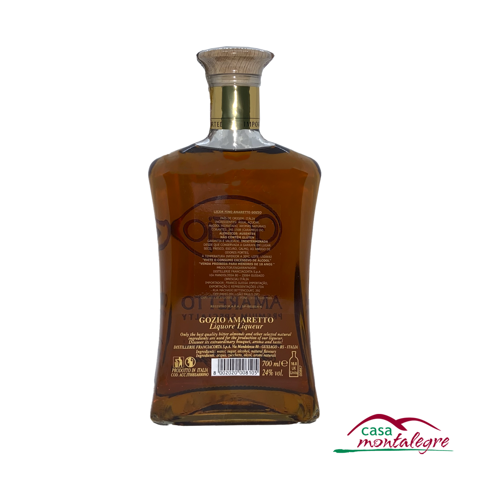 O Amaretto Gozio é um licor de amêndoas de qualidade superior, produzido a partir de uma receita secreta que utiliza apenas ingredientes naturais de altíssima qualidade. Seu bouquet e sabor diferenciados são resultado da infusão de amêndoas amargas, açúcar e álcool por pelo menos 60 dias. Não contém conservantes ou corantes artificiais. Servido puro, com gelo ou combinado em coquetéis, é aromático, delicado e elegante.